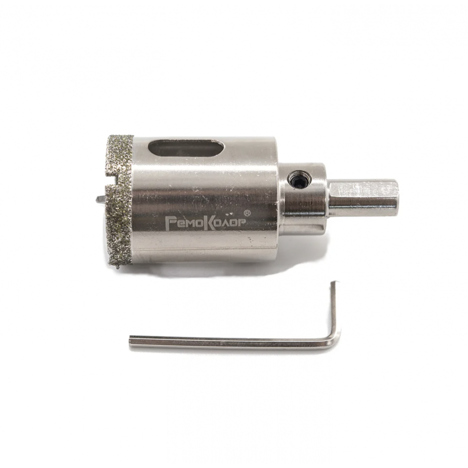 Режущая кромка выполнена с алмазным напылением, что обеспечивает высокую точность сверления и увеличенный ресурс инструмента. Для эффективной работы рекомендуется использовать водяное охлаждение и низкие обороты.