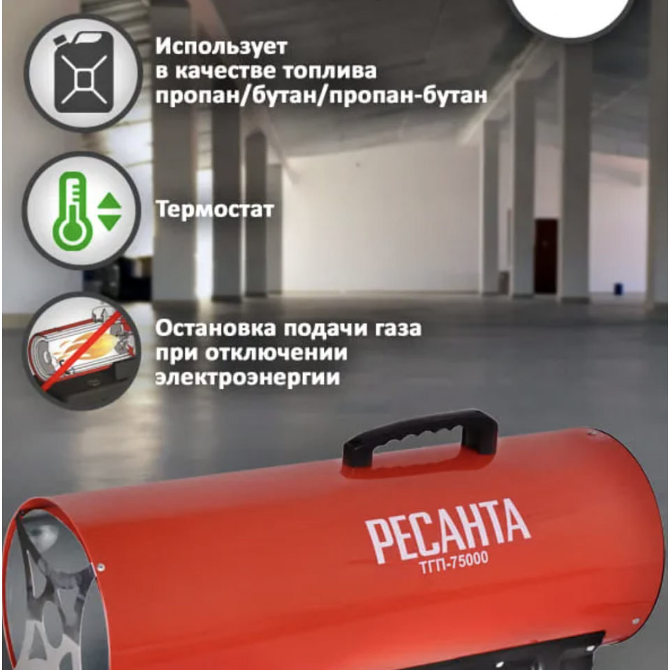 Модель оснащена прочным металлическим корпусом, устойчивым к механическим воздействиям и коррозии. Встроенный вентилятор обеспечивает равномерное распределение горячего воздуха по помещению, а система розжига с пьезоэлементом гарантирует лёгкий и безопасный запуск. Газовая пушка Ресанта ТГП-75000 отличается высоким КПД, экономным расходом топлива и простотой эксплуатации.