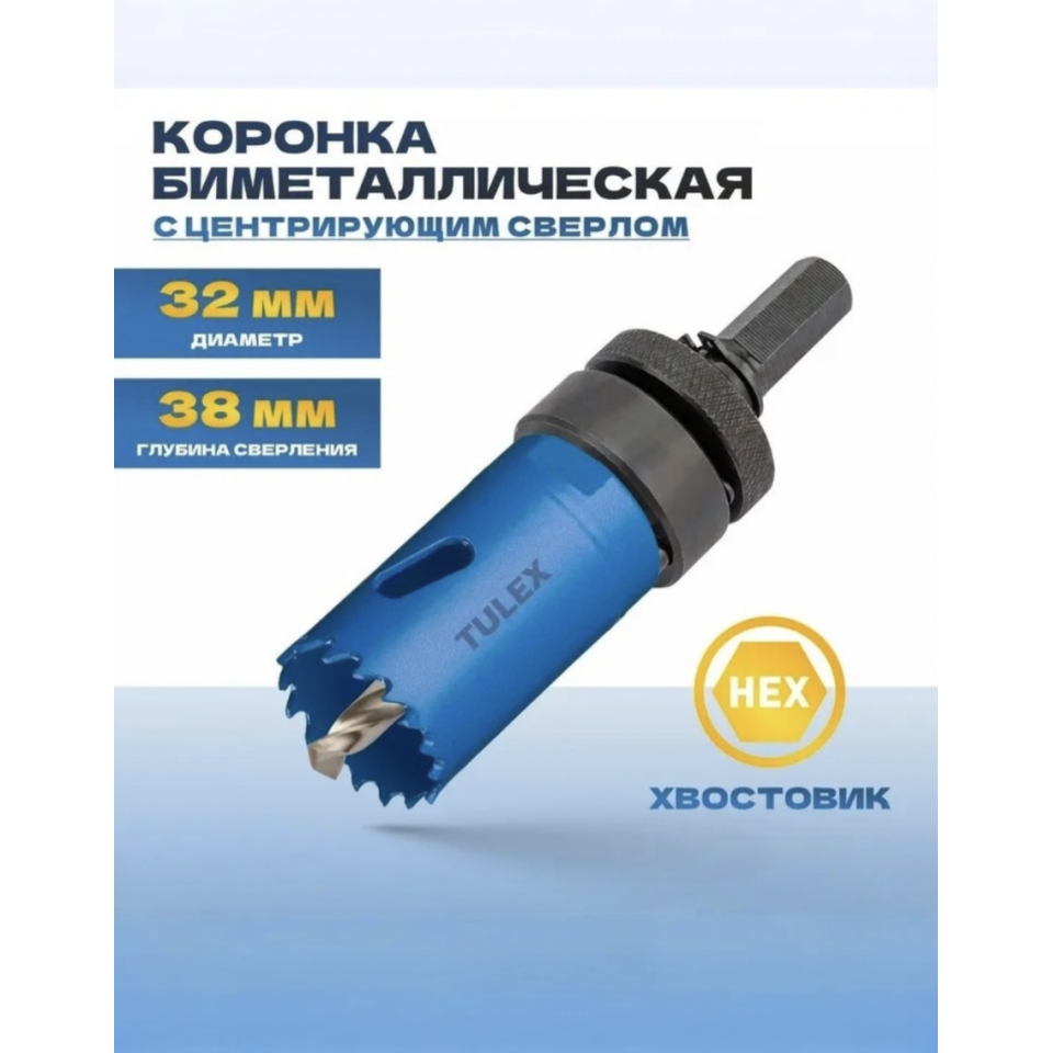 Коронка биметаллическая TULEX 601013-032, с центрирующим сверлом и шестигранным хвостовиком, 32 мм (шт.)