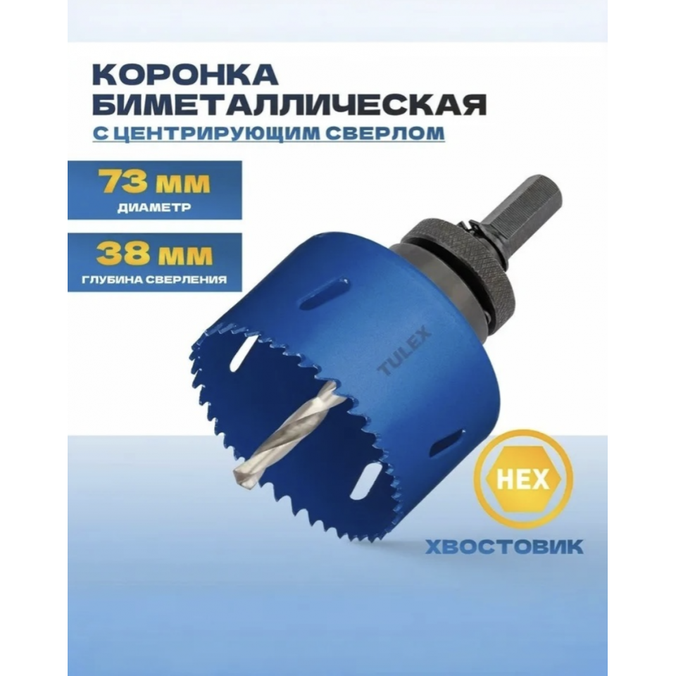 Коронка биметаллическая TULEX 601013-073, с центрирующим сверлом и шестигранным хвостовиком, 73 мм (шт.)